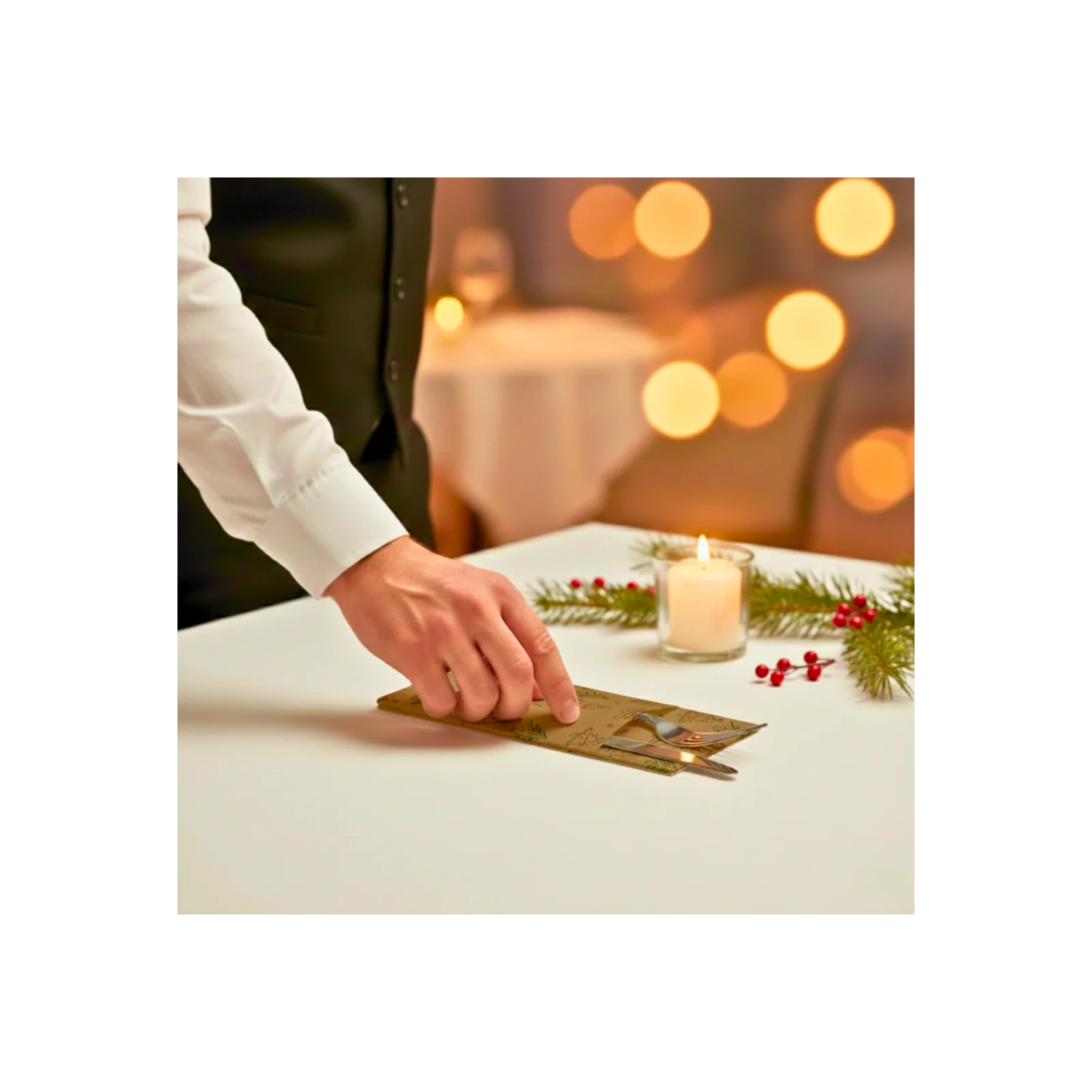 La servilleta Kanguro de color ECO con estampado navideño es la opción perfecta para decorar mesas en la temporada festiva, combinando sostenibilidad y funcionalidad. Fabricadas en papel reciclado, estas servilletas ofrecen un diseño práctico con bolsillo integrado para cubiertos, siendo ideales para hostelería. Cada paquete contiene 30 unidades, y la caja incluye 16 paquetes, sumando un total de 480 servilletas, perfectas para establecimientos de alto volumen.